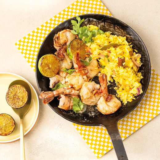 Am besten alles in der Pfanne anrichten: Den Safranreis ebenfalls in die Pfanne setzen und das Garnelen-Bratöl darüberträufeln!