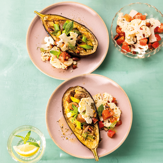 AUBERGINEN MIT MISO-CHAMPIGNONS UND BLUMENKOHLSALAT